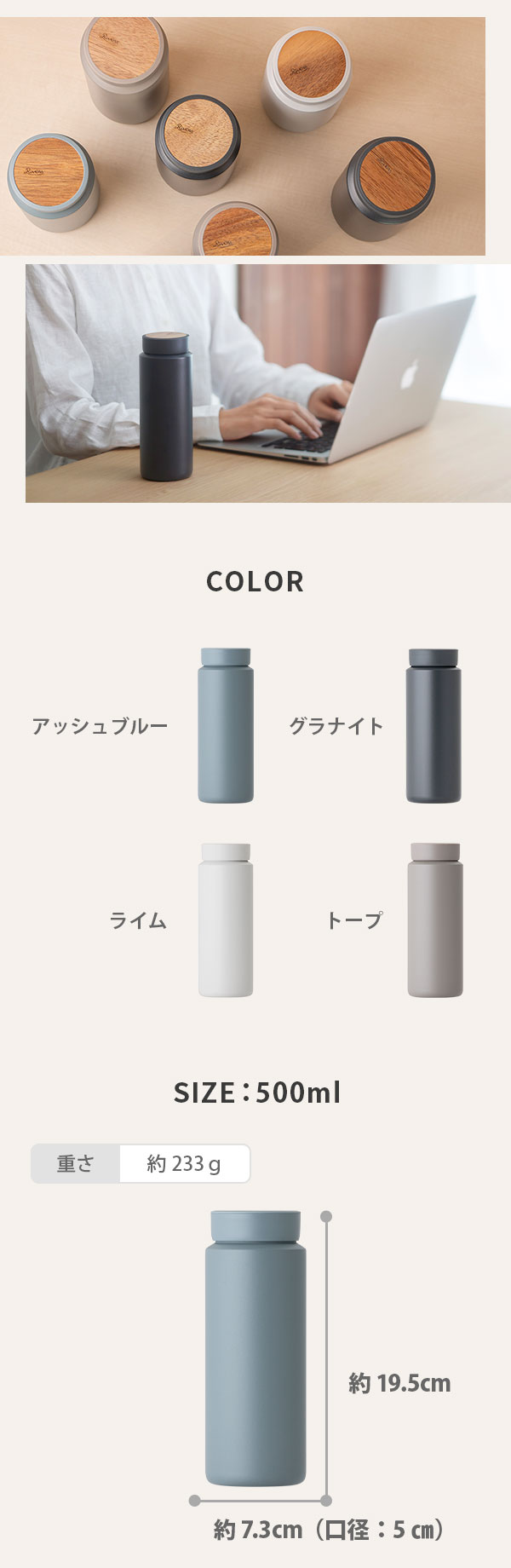 ひとつひとつが異なる天然木をモチーフとした、家具のような真空ステンレスボトルです。木の温もりをドリンクウェアにデザインしてきたリバーズが満を持して送る、木製家具のような佇まいの真空ステンレスボトル。シーンを問わず活躍する500mlサイズです。