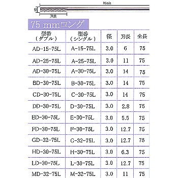C-30-75L 75mmロング超硬ソリッドバー Cシリーズ 3mm軸 シングル目 TAG