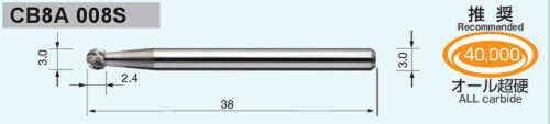CB8A008S 3mm軸 スパイラルカット 刃径Φ3.0mm×刃長2.4mm×全長38mm×シャンク径Φ3.0mm MRA 超硬バー ムラキ