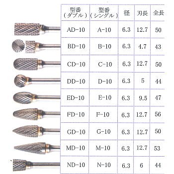 | TAG BURは米国超硬切削工具の大手メーカーへ依頼し、特別に日本向けに製作したロータリーバーです。 1 刃先強度が強く、寿命が長い。 TAGロータリーバーの刃は、すべてCNC機による研削で製造されていますので、均一で安定した機能を発揮できます。 2 コントロールしやすく、使いやすい。 刃先の厚みがチップポケットを浅くし、高速回転使用時に、ロータリーバーが不用意に被削材に食い込んでしまうことを防 止できます。滑らかにコントロール出来、能率アップに貢献します。 3 ロー付け強度の管理が厳重です。 一般的には誘導加熱コイルより短時間でロー付けをしております。TAGロータリーバーはガス加熱で、しかも非接触温度 センサーで超硬とスチールシャンク部分の両方の温度を管理しながらロー付けをしています。このため、ロー付け 作業中に超硬と鉄の熱伝導率の違いによる超硬面の温度不足は発生せずに 完全なロー付けが可能となりました 使用上の注意(安全上の注意) ● 選 定・・加工材の材質、寸法、形状を考慮して研削目的に最適なバーを選定して下さい。 ● 使用回転数・・安全のため突き出し長さを最小にし、必ず最高回転数以下でご使用下さい。 ● バランス ・・作業前には必ず空転させ芯振れチェック等異常がないことを確認して下さい。 ● 加 圧・・加工物に適正な加圧にて作業して下さい。 ● 安全対策 ・・作業中は安全のため保護眼鏡などを使用し、十分な安全対策を講じて下さい。 | |||||||