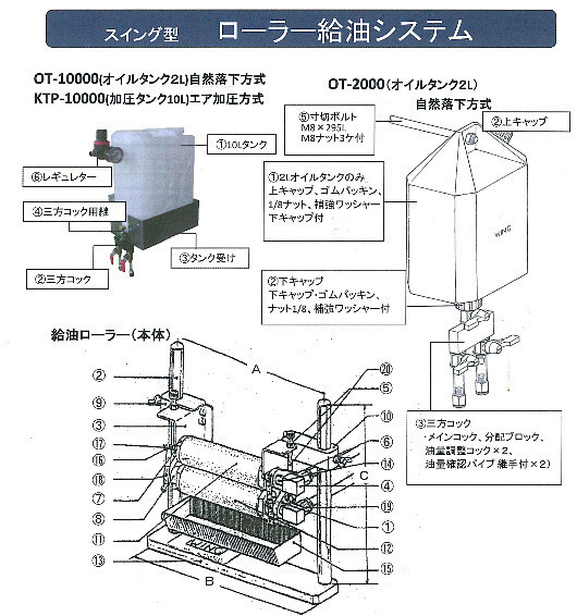 ローラー給油装置用オイルタンク 【特徴(特長)】 ローラー給油装置に接続して簡単に使用できます。 【共通付属品】 | ||