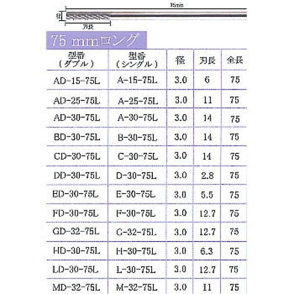 L-30-75L 75mmロング超硬ソリッドバー Lシリーズ 3mm軸 シングル目 TAG