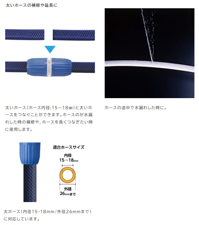 ホースの一部が破損した場合にも、補修アイテムとして便利にお使いいただけます。