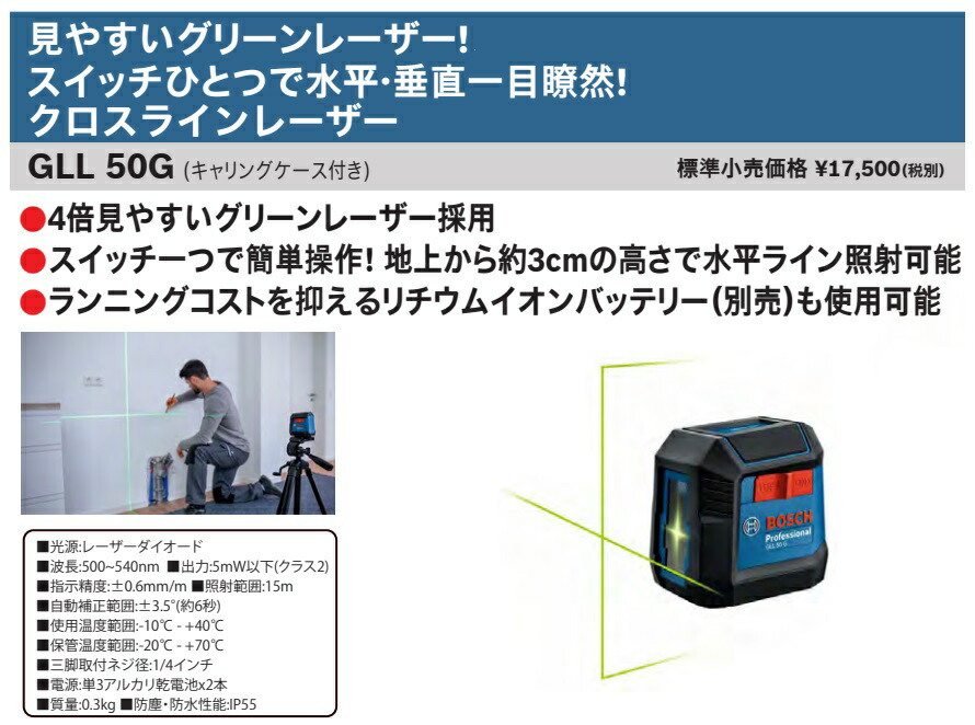 ボッシュ クロスラインレーザー GLL50G キャリングケース付 グリーンレーザー採用 水平・垂直 BOSCH 在庫
