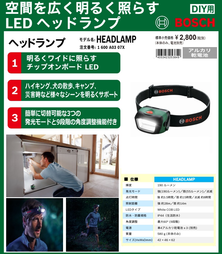 (ボッシュ) ヘッドランプ HEADLAMP 3つの発光モード 9段階角度調整機能付 BOSCH