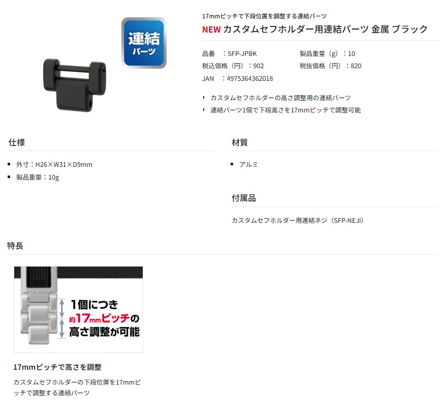 17mmピッチで下段位置を調整する連結パーツ