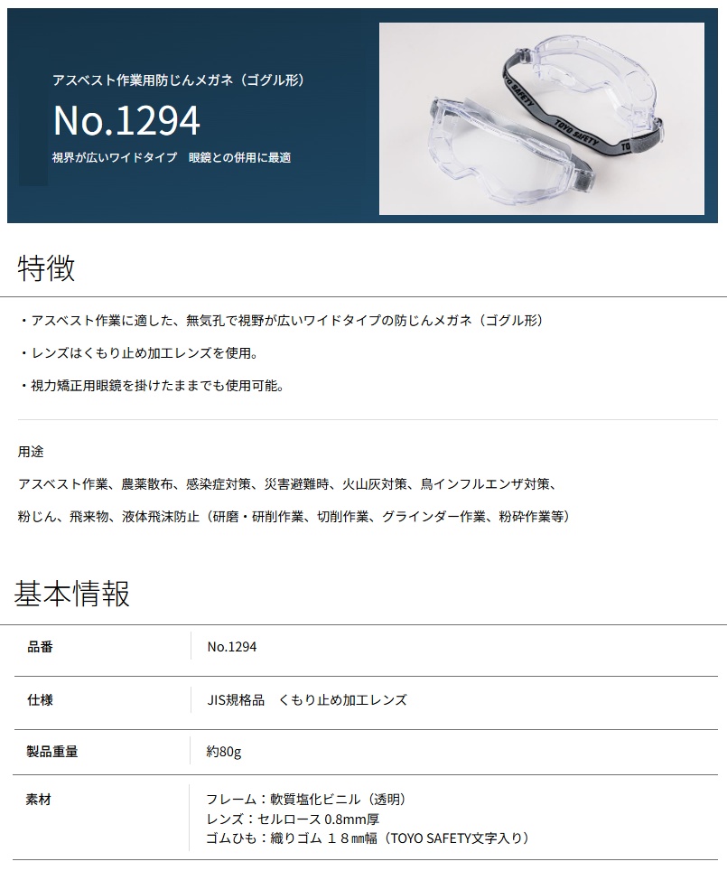 トーヨー No.1294 アスベスト作業用防じんメガネ ゴグル形 TOYO SAFETY 603481 '