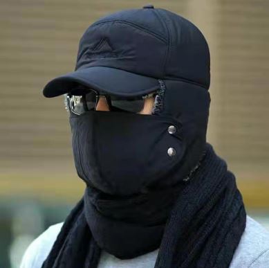 フルにおろしてマスクを着けて完全防寒また耳当ては頭の上で止めることも
