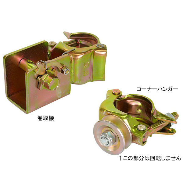 ■適用パイプ径:φ48.6/φ42.7mm■適応ワイヤー径:6mm以下■クランプ締付トルク(N・m):34■巻取機重量:867g■コーナーハンガー重量:496g■材質:鉄(クロメートメッキ仕上)■セット内容:巻取機×2、コーナーハンガー×2
