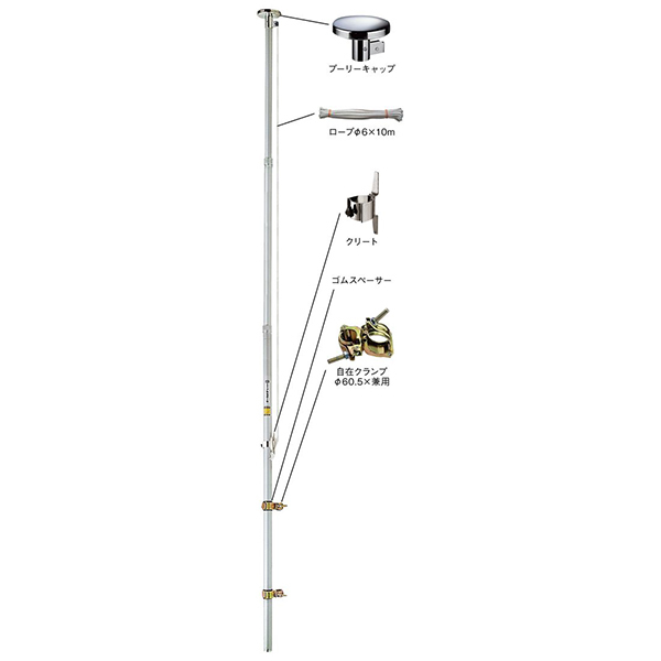 ■ポールサイズ:長さ6040mm(収納時:2250mm)■キャップ傘径:φ150mm■ロープ長さ:10m■ロープ径:φ6mm■セット重量:7.5kg■材質:ポール…アルミ合金、キャップ・クリート…ステンレス、ロープ…クレモナ、クランプ…鉄(クロメートメッキ仕上)■セット内容:ポール(キャップ付)×1、クリート×1、自在クランプ×2、ゴムスペーサー×2、ロープ×1