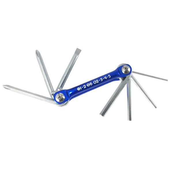 折込式のレンチシリーズで、アルミ合金ボディの軽量でスタイリッシュなハンディツールです。ミリサイズの6角棒レンチとドライバーがセットされています。