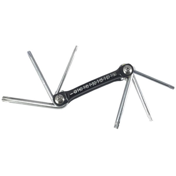 折込式のレンチシリーズで、アルミ合金ボディの軽量でスタイリッシュなハンディツールです。トルクスネジ用レンチがセットされています。