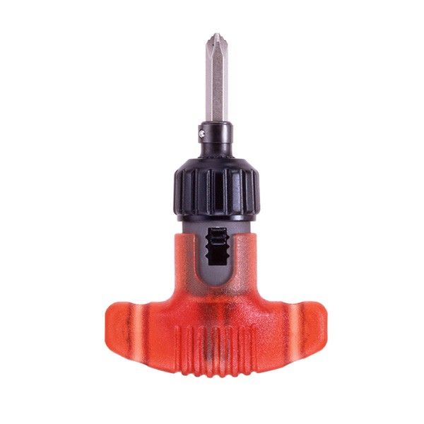 ラチェット機構を搭載ドライバー本体はラチェット機構を搭載しているので、連続作業が大変楽です。また締める・固定・ゆるめるの切換えは本体中心部のツメの操作のみの簡単仕様。これ1本で4サイズに対応!差込式のマルチビットを採用しています新開発の小さいネジ用(+1)、普通ネジ用(+2)、大きいネジ用(+3)、マイナスビット(−5)対応のマルチビットを使用しています。あらゆる状況で活躍できる1本です。家庭用のネジはほとんど回せるよう、サイズを厳選しています。