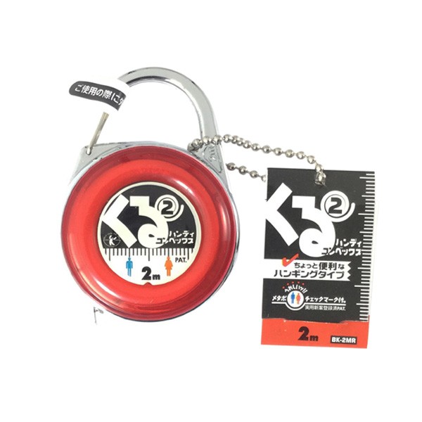 便利なハンギングタイプ。最長2mのコンパクトメジャーメタボチェックマーク(PAT)が目盛に付いているのが特長で、遊びご心のあるミニコンベックスとなっています。