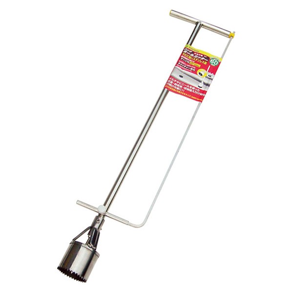 サビにくいステンレス製穴あけ器。マルチやビニールを使った花苗・野菜苗・球根植え付け時の穴開け作業に!!立ったまま楽に作業できるサイズ。刃部保護カバー付き。