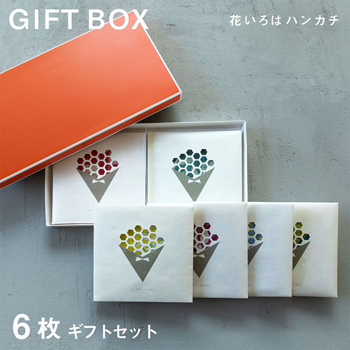 オレンジのギフトボックスに、 花いろはハンカチ 6枚 をお入れしてお届けいたします。 |