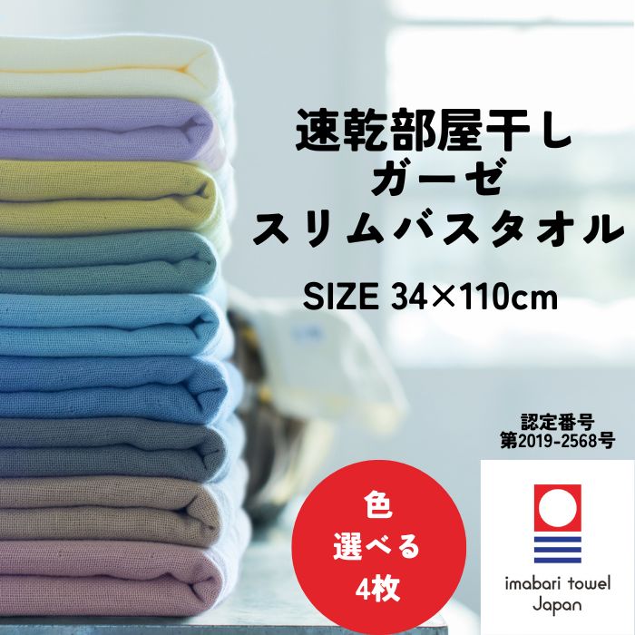 今治タオル 速乾 部屋干し スリムバスタオル 34×110cm 4枚 選べる ガーゼ 薄手 無地 吸水 綿100% やわらかい プレゼント まとめ買い 送料無料 花粉 対策