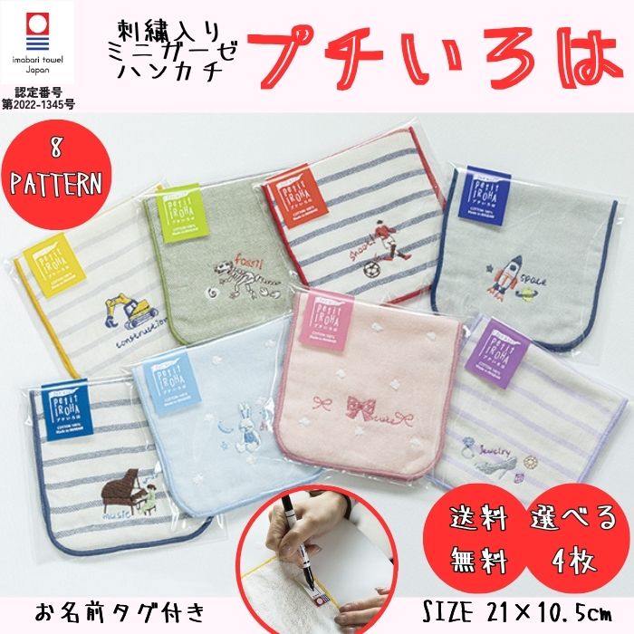 今治タオル ハーフハンカチ 刺繍 21×10.5cm 4枚 選べる プチいろは ガーゼ クリスマス ギフト プレゼント 個包装 ブランド 女の子 男の子 まとめ買い 送料無料