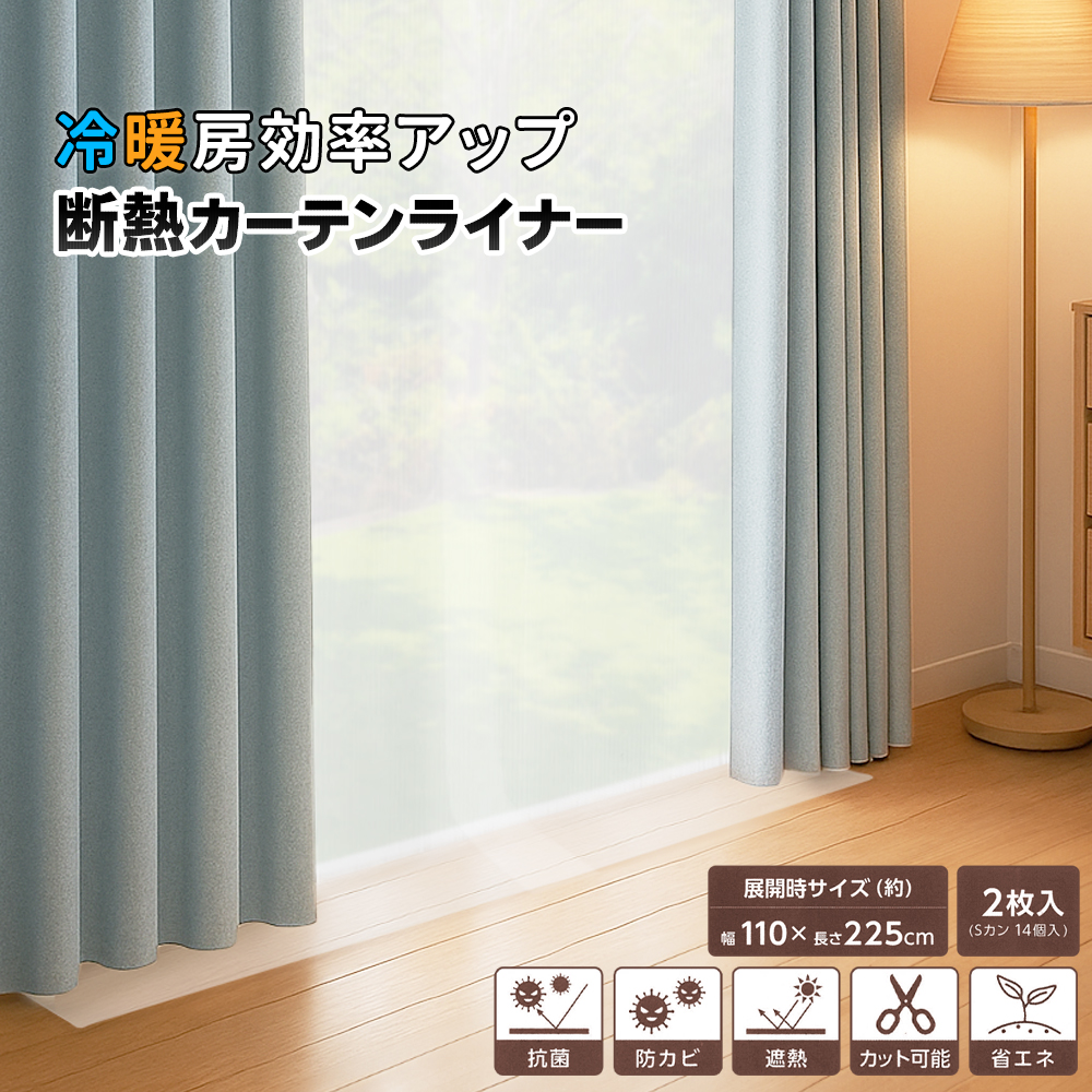 カーテン 断熱 2枚組 丈225cm 幅110cm 長さ調節可能 抗菌 防カビ カットできる 暖房 寒さ対策 節約 UVカット 窓 防寒 シート 簡単 /60N◇ 断熱カーテンライナー