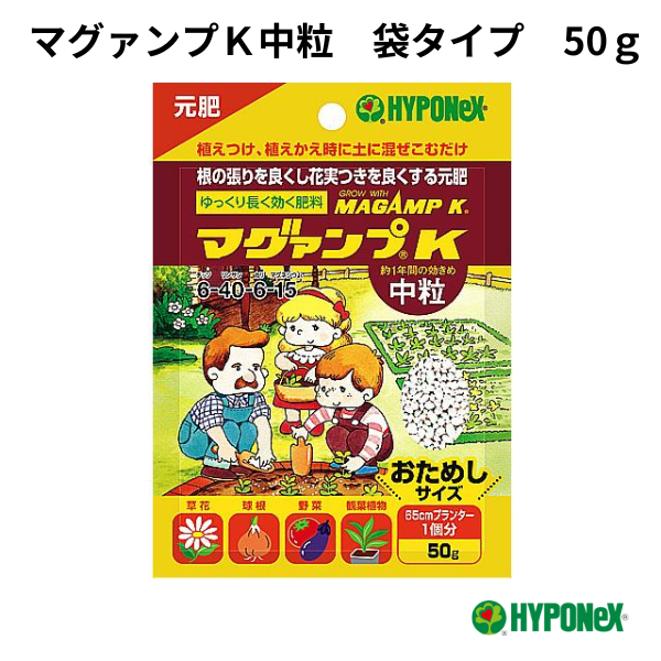 土に1回混ぜ込むだけで長く効く元肥!(約1年間の効きめ) ●いろいろな植物の植えつけ、植え替え時に土に混ぜ込むだけで、ゆっくり長く効き続け、植物の生育を良くします ●リンサン(P)の効果で、花・実つきを良くすることはもちろんのこと、根の伸長を促進する効果もあります ●草花・球根・プランターなど、いろいろな植物に適しています N-P-K-Mg=6-40-6-15 マグネシウム配合