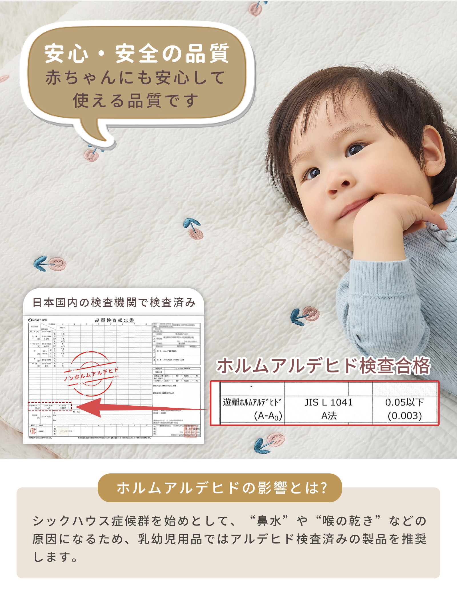 日本国内の検査機関で安全性を確認済み。ママも安心して選べます。