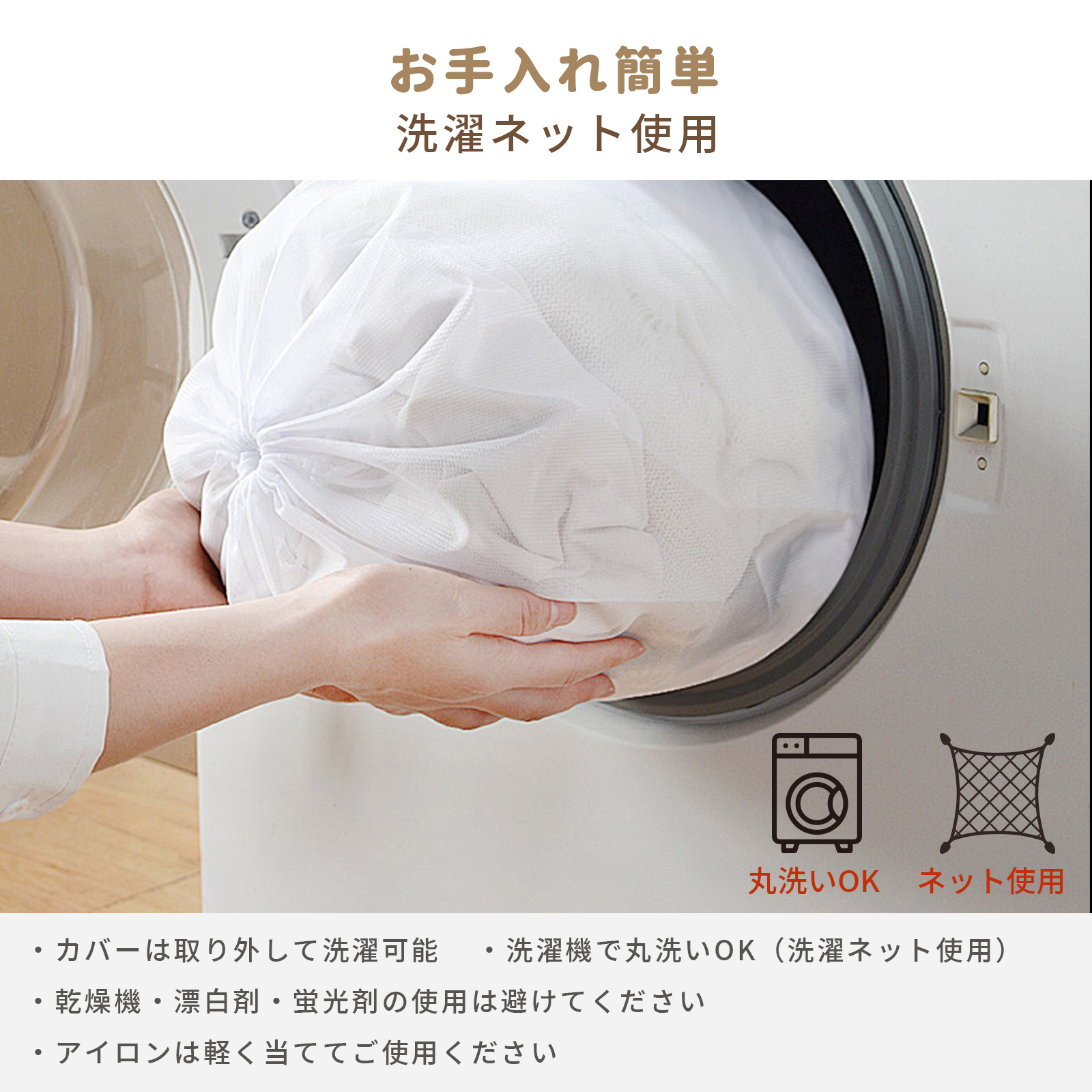 ・カバーのファスナーは閉してお洗濯してください。