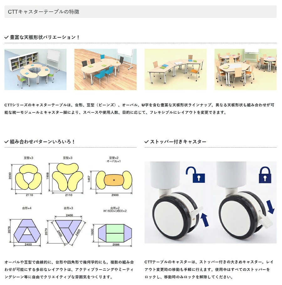 | CTTシリーズ キャスターテーブル 豊富な天板形状バリエーションにより多様なレイアウトを展開できるCTTシリーズのキャスター付きテーブル。空間をフレキシブルに運用したいオフィスのミーティングテーブルや作業テーブル、アクティブラーニングの教室のテーブルとして等、多目的にご利用いただけるキャスターテーブルです。 |