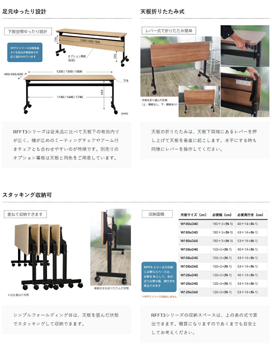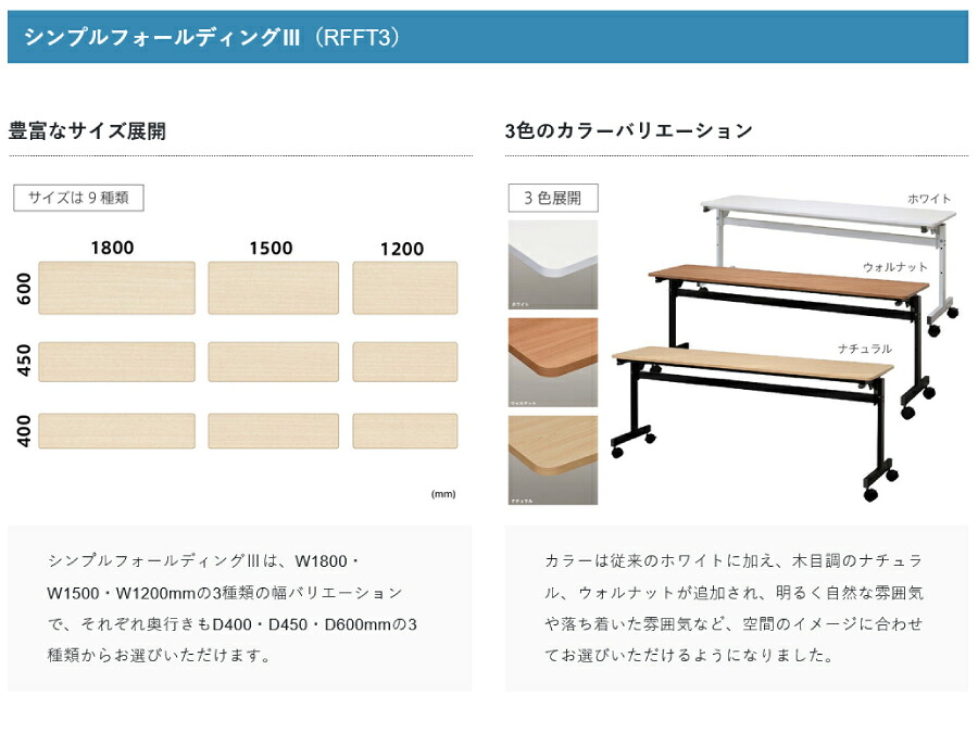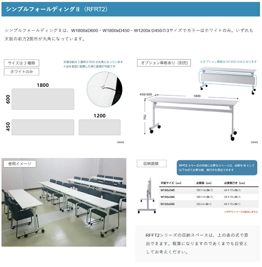 | シンプルフォールディングテーブル ラックを省いたシンプル設計のシンプルフォールディングテーブル。最新シリーズは、W1200・W1500・W1800mmの3種の幅バリエーションに加え、奥行きもD400・D450・D600mmの3種類を完備しており、会議室や教室のスペースに合わせた効率のよいレイアウトが可能です。インテリアのイメージに合わせて、より多様なシーンでご利用いただけるようになりました。 |