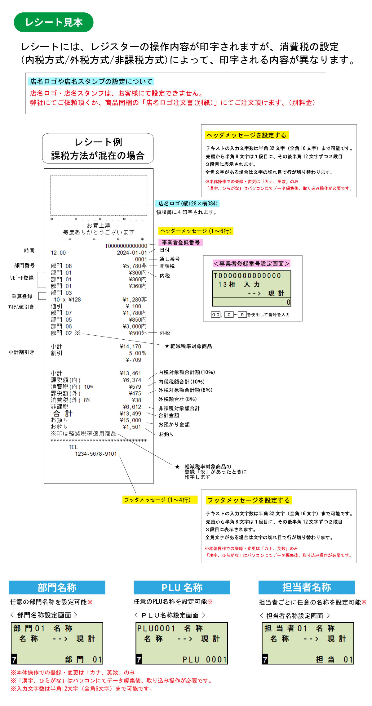 | 設定可能な項目 | 日付、時間、税率(0〜99%)、割引き率(0〜99.99%) 【部門】税、通常売上、単価 【PLU】単価、部門、設定情報印字 【他】担当者の暗証番号有効/無効(暗証番号 3 桁) PLU、部門、担当者、ヘッダー、フッターの文字設定 |