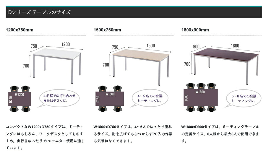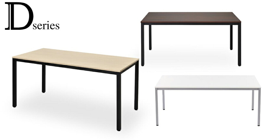 | Dシリーズ オフィステーブル Dシリーズは、ベーシックなデザインのオフィステーブル。天板に配線穴や継ぎ目がないフラットなテーブルで、ミーティングテーブルとしてはもちろんパーソナルデスクとしてもご利用いただけます。サイズはコンパクトなW1200xD750mmを含む3種類のサイズバリエーション。天板カラーは、ホワイト、ナチュラル、ダークの3色、脚部カラーはグレーとブラックの2色で、インテリアのイメージに合わせてお選びいただけます。 |