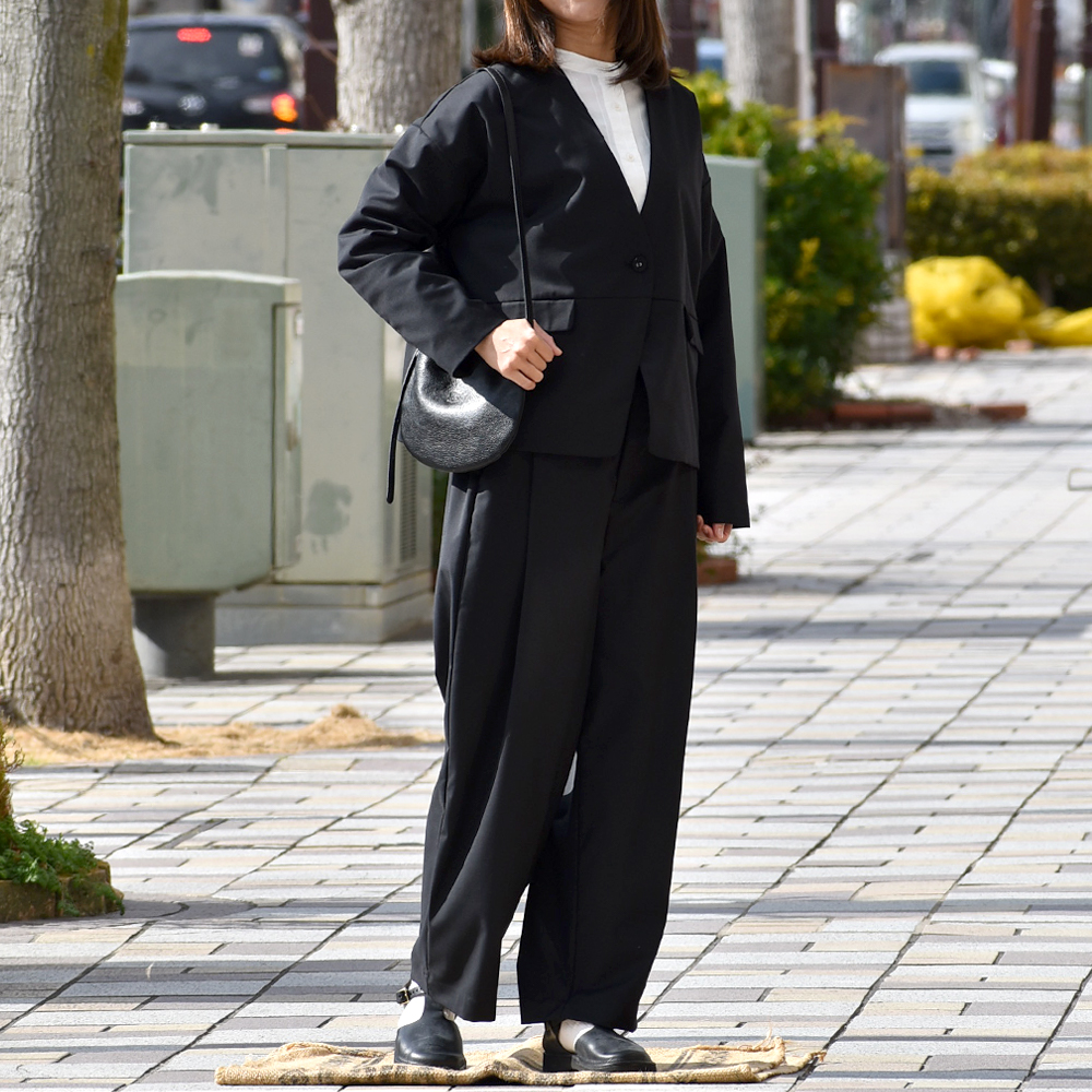 首元はすっきりとしたノーカラーデザイン。