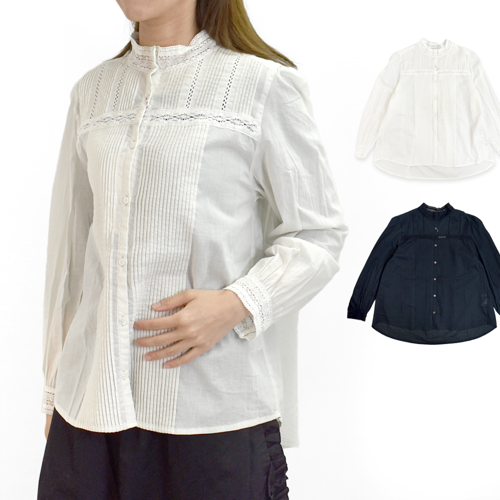 ポンデシャロン PONT DE CHALONS ブラウス スタンドレースカラーピンタックブラウス 長袖シャツ 22610511