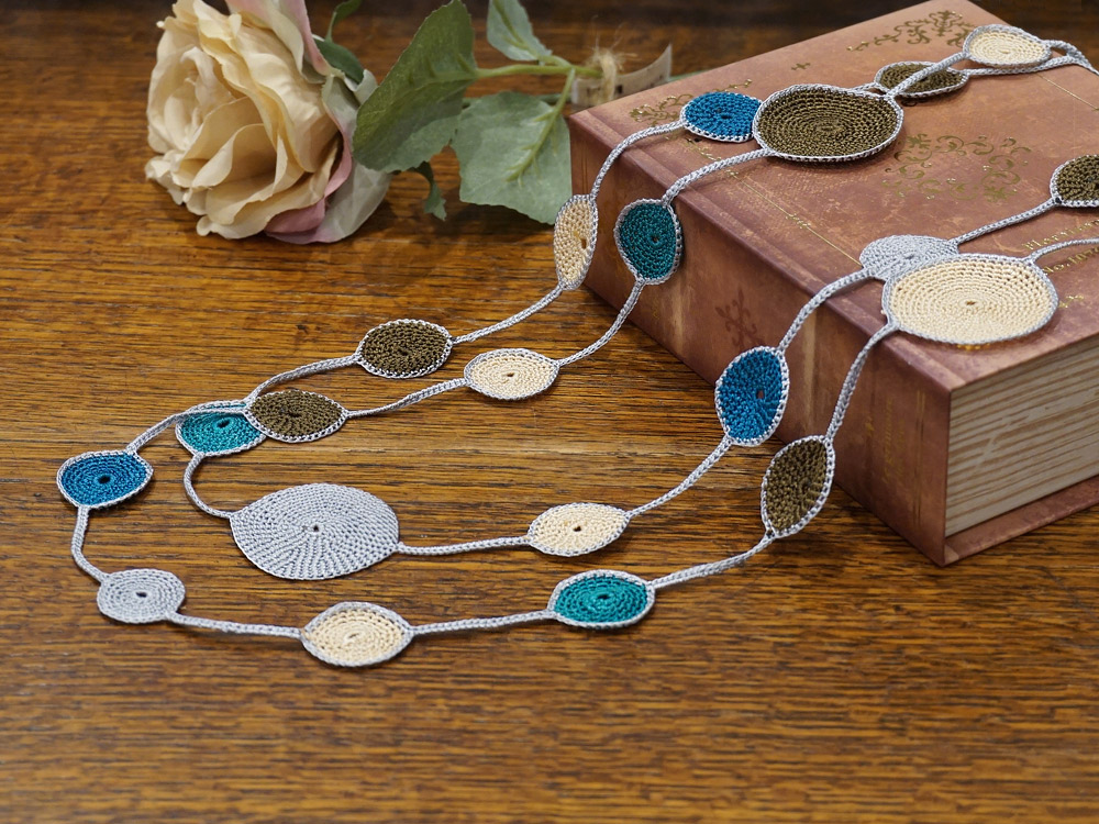 かぎ針で編むトゥーオヤ(クロッシェレース)の技法で、シンプルながらインパクトのあるエリプス(楕円)モチーフに仕上がっています。