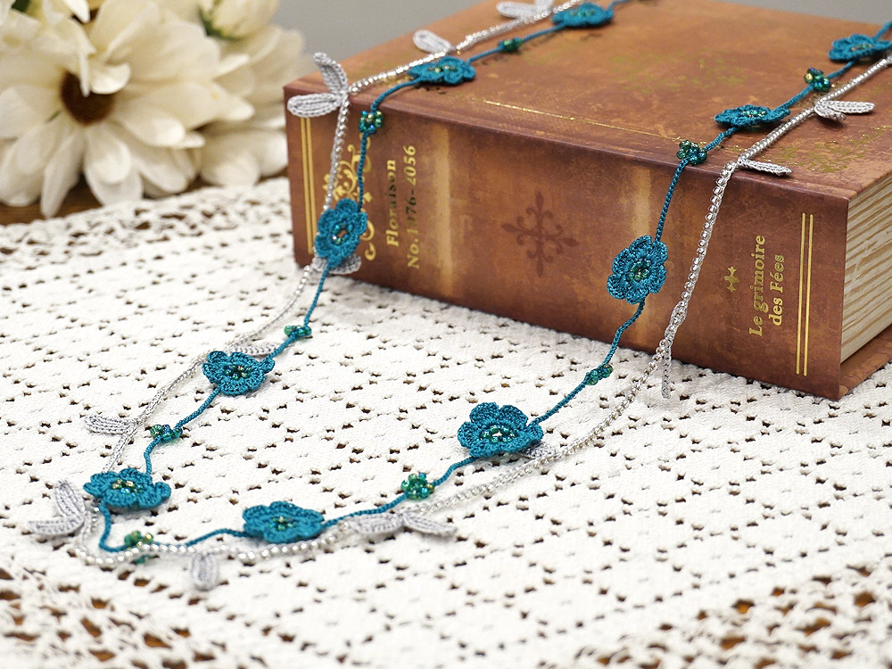 かぎ針で編むトゥーオヤ(クロッシェレース)の技法と、ビーズ(ボンジュック)を編み込む技法を合わせて丁寧に作られた、愛らしい小花モチーフラリエット。
