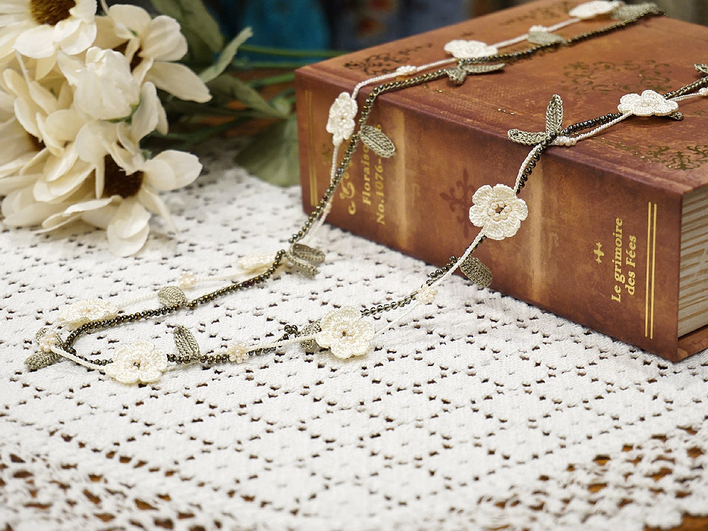 かぎ針で編むトゥーオヤ(クロッシェレース)の技法と、ビーズ(ボンジュック)を編み込む技法を合わせて丁寧に作られた、愛らしい小花モチーフラリエット。