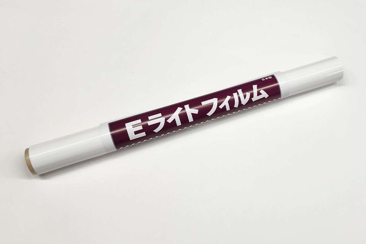 Eライトは、厚み僅か0.02mm(20ミクロン)の特殊な極薄フィルムを使用、1m2あたり27.78gという超軽量で、特に重量に気を使うグライダーやファンフライ機のカバーリングに最適です。