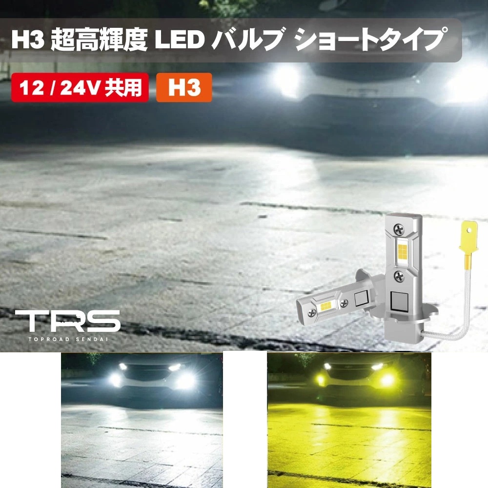 TRS H3 超高輝度LEDバルブ ショートタイプ 12V 24V 2個 防水 IP68 ファンレス キャンセラー内蔵 静音 ホワイト/イエロー