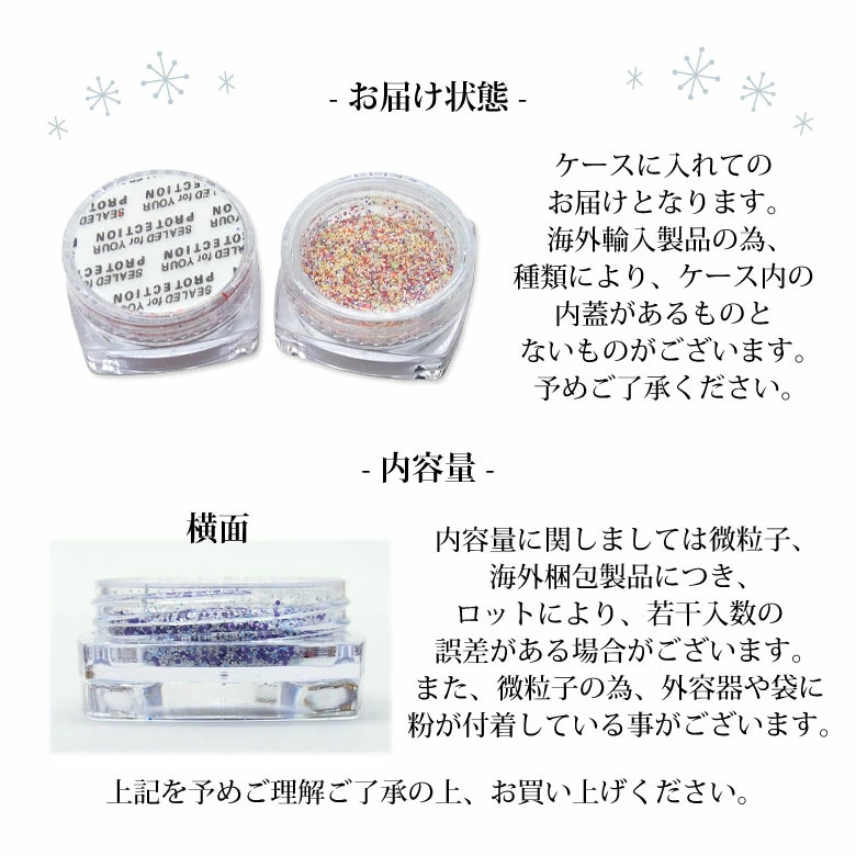 ※内容量に関しましては微粒子、海外梱包製品につき、ロットにより、若干入数の誤差がある場合がございます。