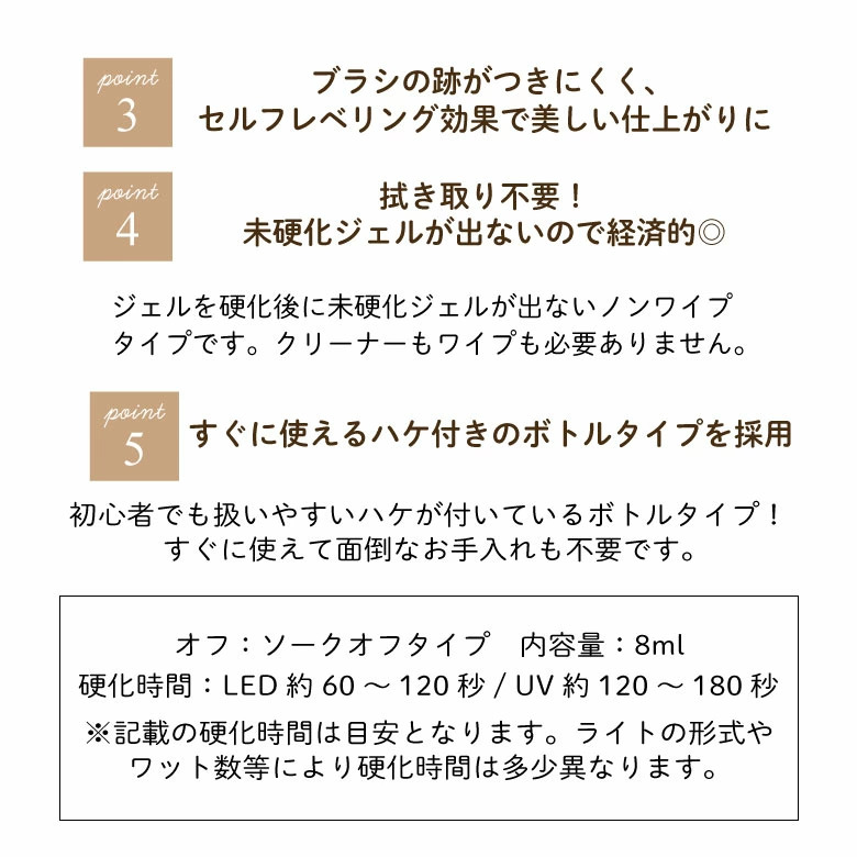 ※ジェルが皮膚に付着した場合は、ウッドスティック等で取り除き、拭き取ってから硬化して下さい。