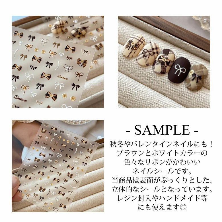 ブラウンとホワイトカラーの色々なリボンがかわいいネイルシールです。