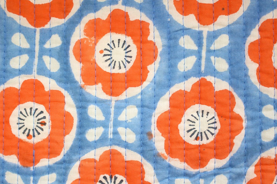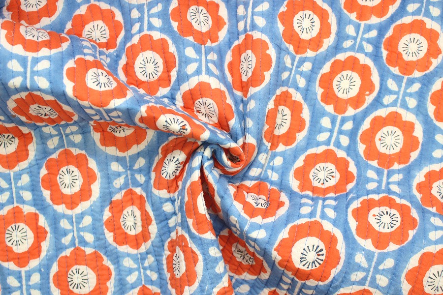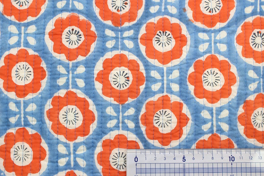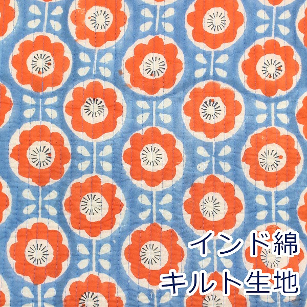 生地 布 インド綿 キルト サックス 北欧風 花柄 フラワー ヌビ風 イブル風 キルティング 綿100% 約95cm幅 宅配便のみ 10cm単位価格