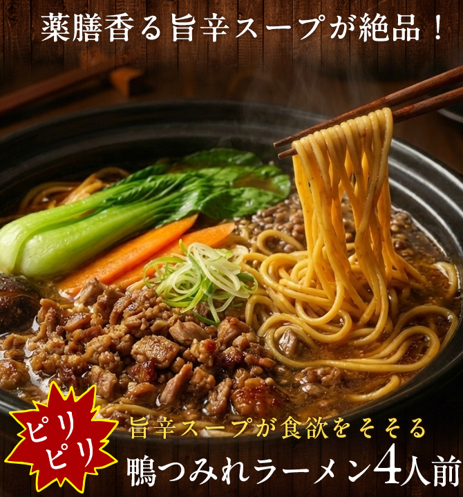 薬膳香る旨辛スープが絶品!食通も絶賛の鴨つみれラーメン4食入り。