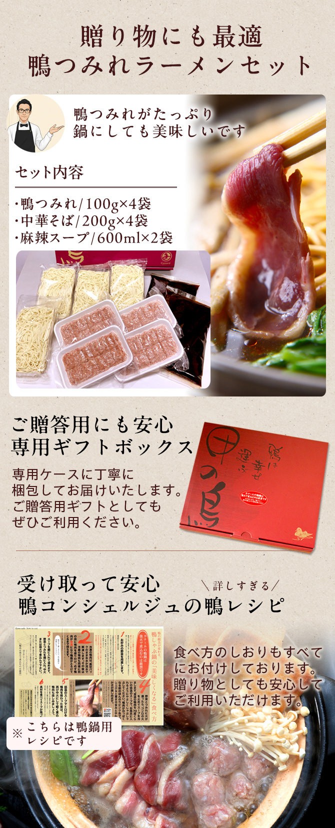 4人前(鴨つみれ100g×4袋、中華そば200g×4袋、麻辣スープ600ml×2袋)