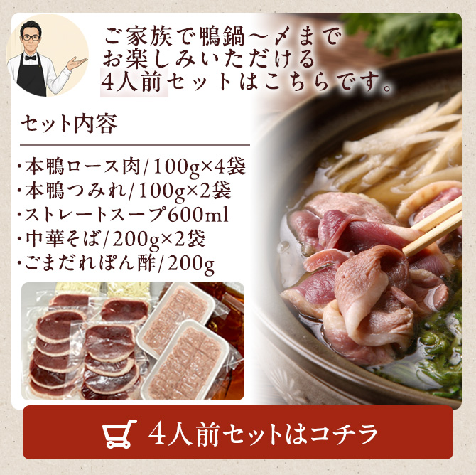| 内容量 | 4人前(本鴨ロース肉100g×4袋、鴨つみれ100g×2袋、中華そば200g×2袋、スープ600ml×2袋、ごまだれポン酢200g) |