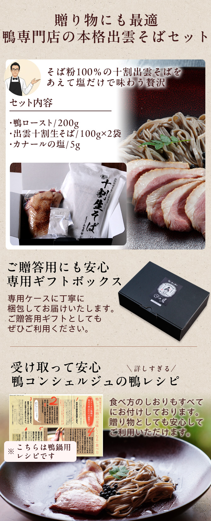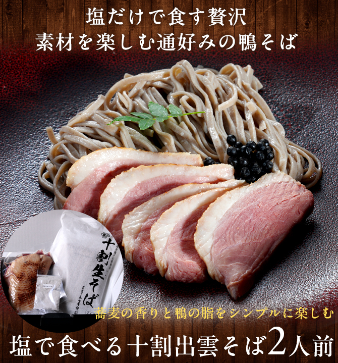 | 原材料 | 【なまそば】そば粉(そば(島根県産))、食塩 【鴨肉】鴨肉(タイ産)、食塩 【調味塩】食塩(国内製造)、野生植物抽出ミネラル(昆布、ワカメ、竹、松葉、ビワ葉、イタドリ、熊笹、クズ葉、ヨモギ、ドクダミ、スギナ、その他) |