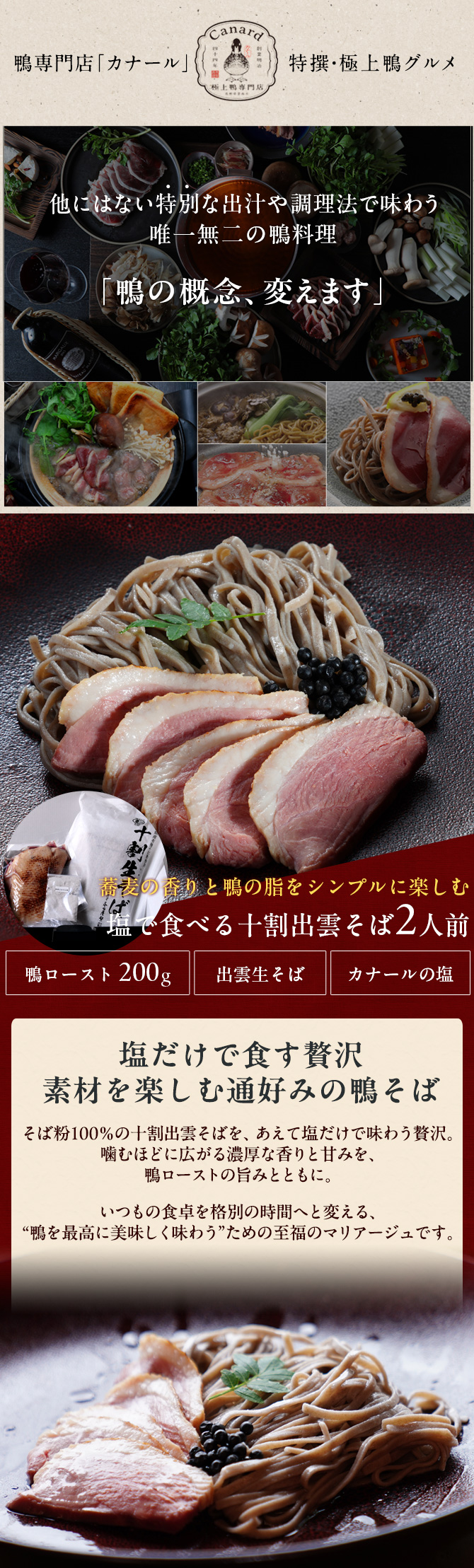 | 内容量 | 2人前(鴨ロースト200g、なまそば200g、調味塩5g) |