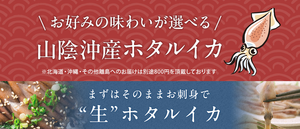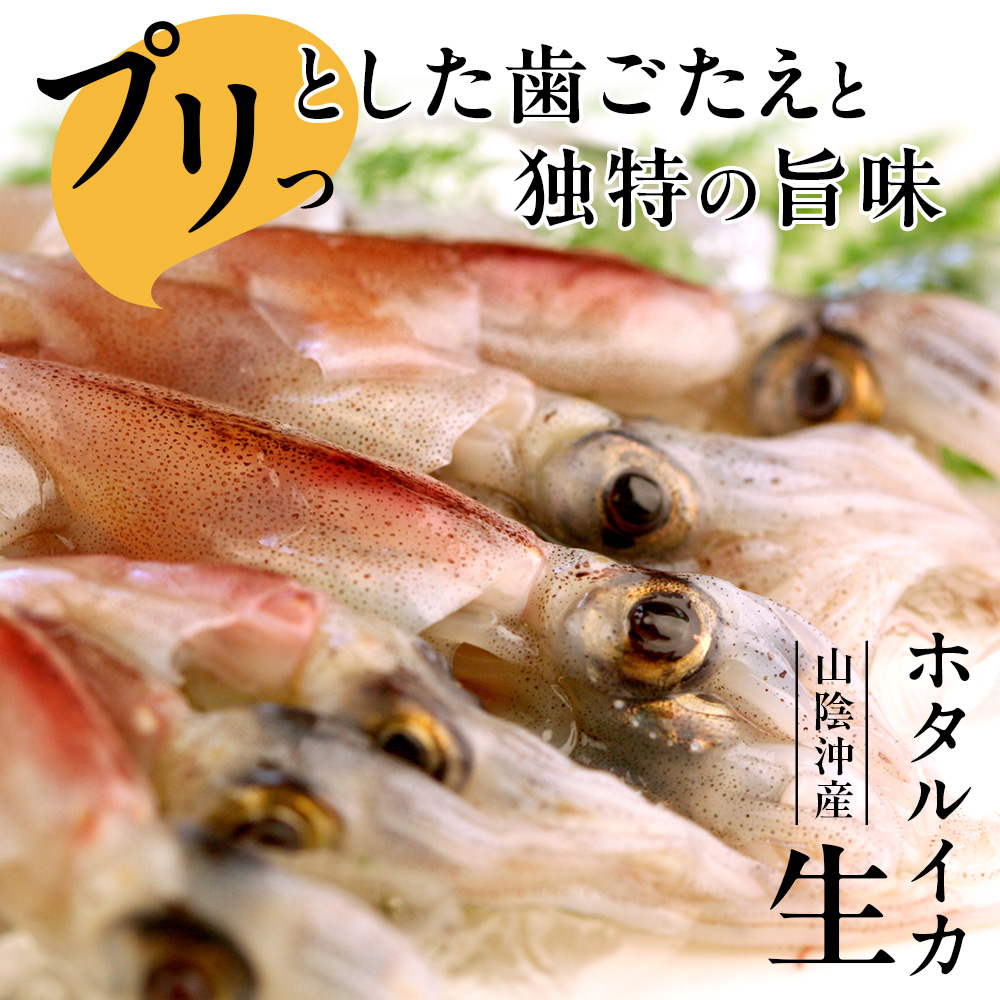 日本海の美味しい味覚、ホタルイカ。プリッとした歯ごたえと、お口の中いっぱいに広がる芳醇な香りは、海産物が豊富な山陰沖ならではの逸品。内蔵は旨味成分のひとつであるアミノ酸がたっぷりで甘味が強く、はらわたごと味わうと特に美味しいと評判です。
