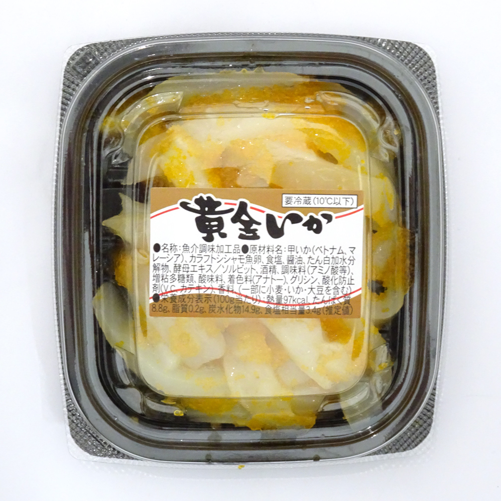 甲いか(ベトナム、マレーシア)、カラフトシシャモ魚卵、食塩、醤油、たん白加水分解物、酵母エキス/ソルビット、酒精、調味料(アミノ酸等)、増粘多糖類、酸味料、着色料(アナトー)、グリシン、酸化防止剤(V.C、カテキン)、香料、(一部に小麦、いか、大豆を含む)