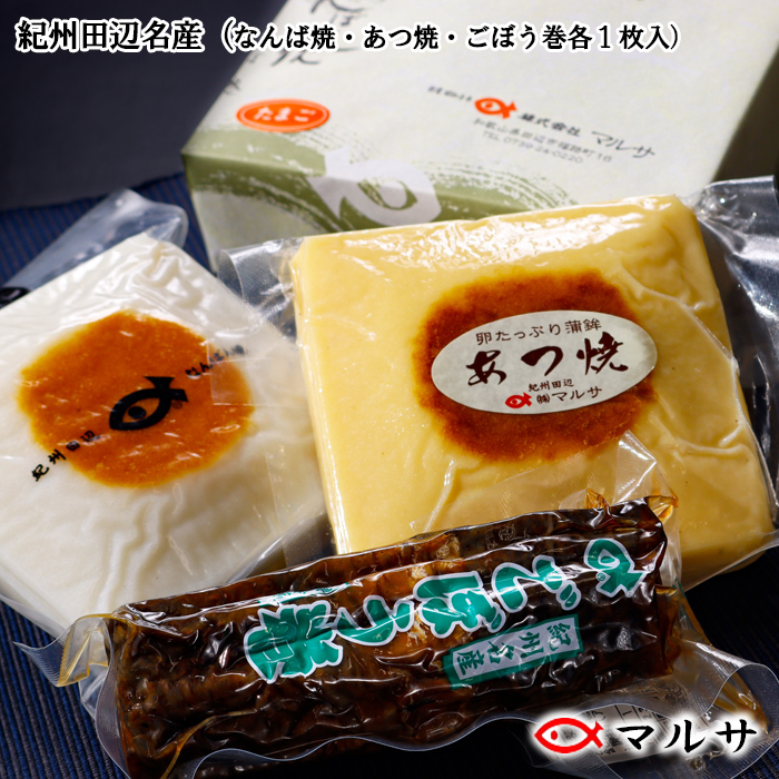紀州田辺に江戸時代より伝わる伝統の焼蒲鉾「なんば焼」と、卵たっぷりの蒲鉾「あつ焼」、魚皮をやわらかく茹でたゴボウに巻きつけ秘伝のタレで焼き上げた「牛蒡巻」のセットです。