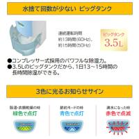 | 仕様・ 特徴 | コンプレッサー式だから、部屋干しも除湿もお得で快適。 除湿方式:コンプレッサー式除湿機 除湿能力:除湿量1日6.3L(50Hzは5.6L) タンク容量:約3.5Lで自動停止 電源:単相100V 一般ルートモデル コンパクトタイプ 消費電力(50/60Hz): 除湿時 160/180W 衣類乾燥時 160/180W 除湿可能面積のめやす: 50Hz:プレハブおもに11畳(18m2)、木造7〜鉄筋14畳(12〜23m2) 60Hz:プレハブおもに12畳(20m2)、木造8〜鉄筋16畳(13〜26m2) 電源コード:1.8m 運転モード:除湿(標準・節約)・衣類乾燥・送風 |